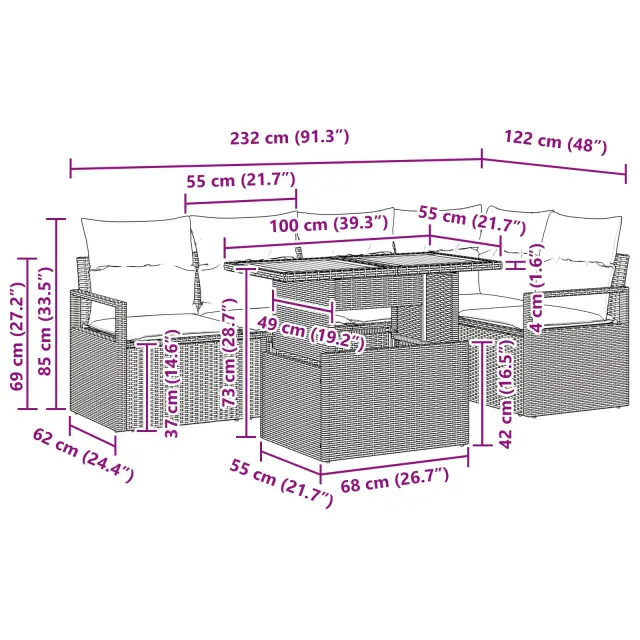 • Visokokakovostni materiali: Izdelan iz vrhunskega Poli Ratan, znanega po svoji UV odpornosti, zagotavlja vzdržljivost seta proti soncu in vremenu ter ponuja izpiljen naraven videz s svojo teksturo površine. Jeklo s prašnim premazom dodaja moč in stabilnost konstrukciji, kar je ključno za trajnost v zunanjem okolju.