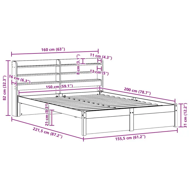 Ta okvir postelje iz lesa prinaša vrhunsko obrtništvo in eleganten sodoben dizajn, kar ga dela brezčasno izbiro za vsak spalni prostor. Narejen je iz trdega borovega lesa, ki s svojo voskasto rjavo obdelavo lepo dopolnjuje različne sloge. Platformni dizajn nudi močno podporo in pripomore k mirnemu spancu, medtem ko vgrajeno naslonjalo s policami ponuja priročen prostor za shranjevanje in razstavljanje, kar izboljšuje organizacijo. Zasnovan za notranjo uporabo, je ta okvir postelje lep in funkcionalen osrednji kos.