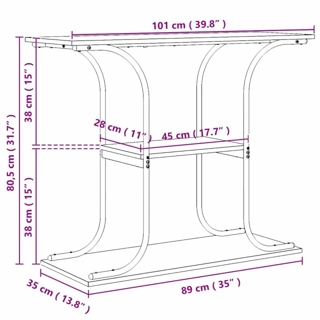 Ta industrijska konzolna miza doda sodobno noto vsakemu hodniku s svojim modernim pravokotnim dizajnom. Zasnovana je tako, da služi tako funkcionalnosti kot slogu, idealna je za tiste, ki želijo izboljšati svoje prostore z minimalistično noto. Z dimenzijami 101 x 35 x 80,5 cm se popolnoma prilega ozkim prostorom, pri čemer ponuja dovolj prostora, ne da bi bila prevelika. Njene temne barve in okvir iz inženirskega lesa nudijo gladko in elegantno površino, ki doda značaj kot razstavni in shranjevalni kos v vašem domu.