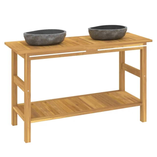 Omarica je izdelana iz trdne tikovine, ki je dovolj trpežna in čvrsta, da lahko na površino postavite umivalnik in druge kopalniške dodatke. Kozmetična omarica ima držalo za obešanje brisač ali oblačil. Ima tudi štiri podporne noge za zagotavljanje stabilnosti in suhosti nad tlemi. Osupljiv umivalnik je uporabniku prijazen za vsakodnevno uporabo in je čudovit okras za vaš bivalni prostor. Umivalnik je v celoti ročno izdelan iz rečnega kamna in je izjemno trpežen ter elegantnega videza. Poleg tega je umivalnik zelo enostaven za čiščenje. Omarica se popolnoma poda pod vaš umivalnik ter poskrbi, da je prostor v kopalnici dobro izkoriščen.