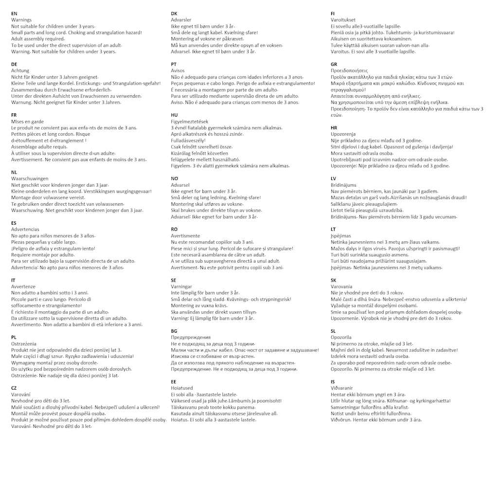 Opozorila Ni primerno za otroke, mlajše od 3 let. Majhni deli in dolg kabel. Nevarnost zadušitve in zadavitve! Izdelek mora sestaviti odrasla oseba. Za uporabo pod neposrednim nadz-orom odrasle osebe. Opozorilo. Ni primerno za otroke mlajše od 3 let.