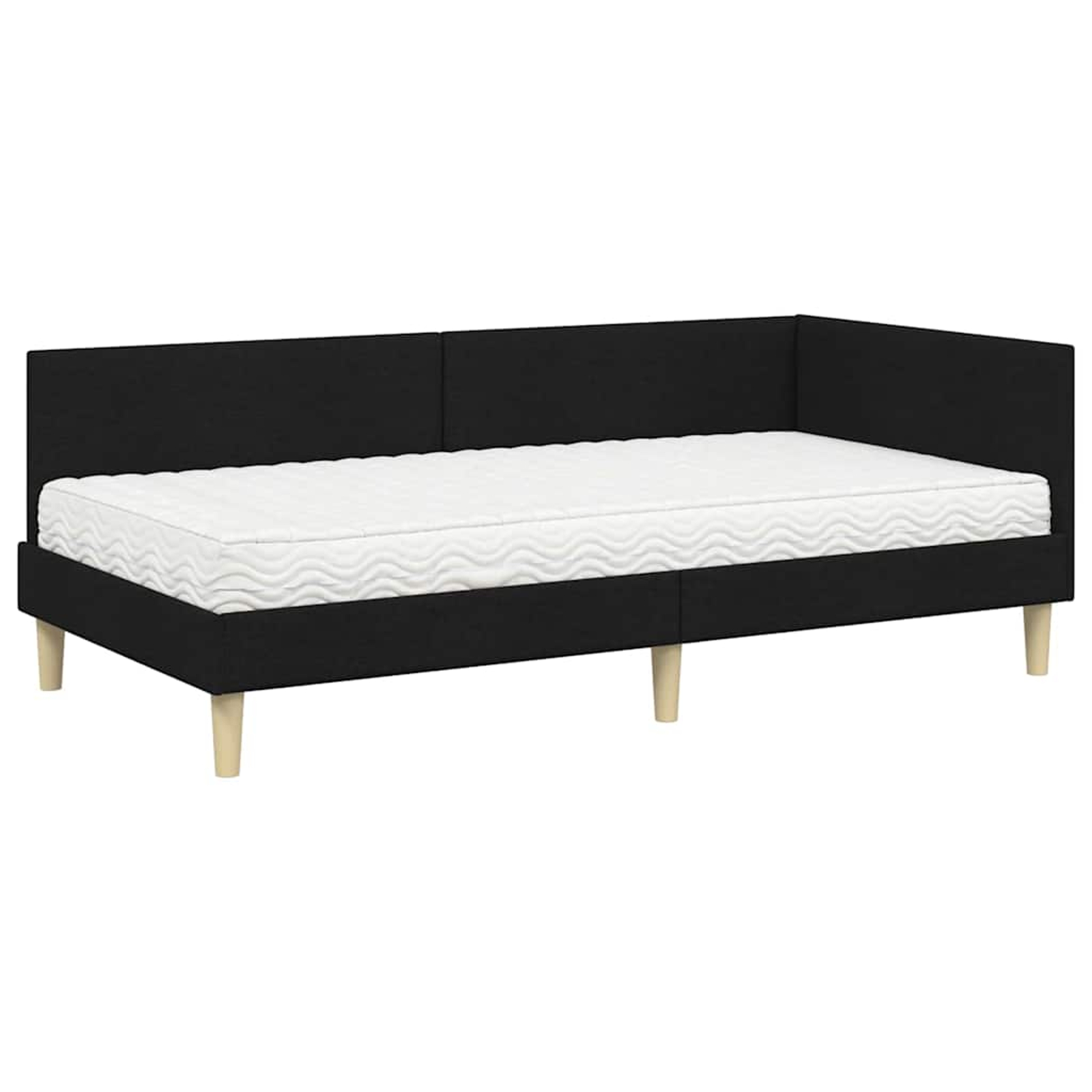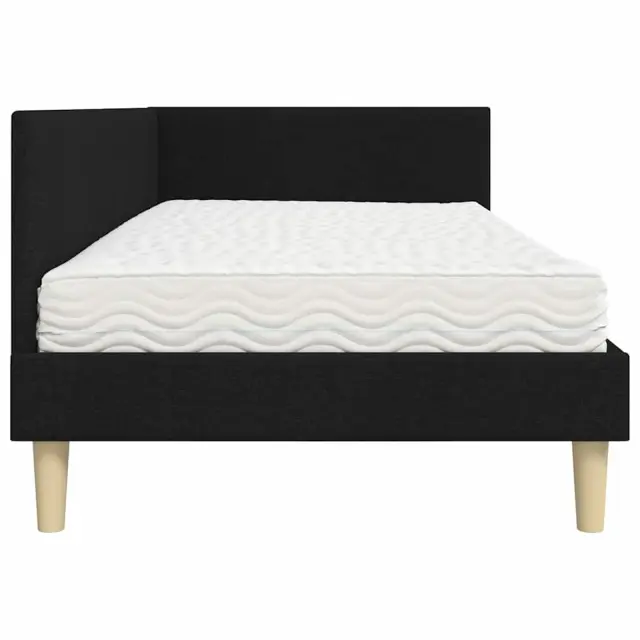 Ta kotni okvir postelje s vzmetnico ponuja perfektno kombinacijo sodobnega sloga in udobja, kar ga dela popolno središče vsake moderne spalnice. Gladek, tkaninski vzglavnik je pritrjen na steno, kar omogoča urejen in prostoren videz sobe, preostali del postelje pa prikazuje minimalističen dizajn, ki prinaša spokojno vzdušje.