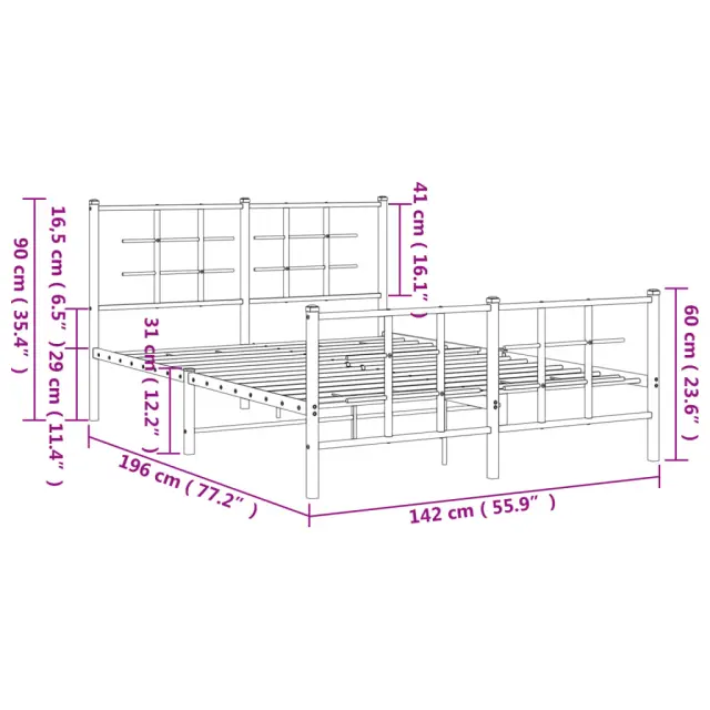 Če iščete trpežen posteljni okvir za svojo spalnico, je ta klasični posteljni okvir z elegantnim in brezčasnim dizajnom popolna izbira! Robustna kovinska konstrukcija: Okvir postelje je izdelan iz prašno barvanega jekla. Jeklo je izjemno trd in močan material, ki zagotavlja izjemno trdnost in stabilnost.Kovinske letvice in noge: Kovinski posteljni okvir je opremljen s kovinskimi letvami in sredinskimi nogami, ki ležišču nudijo nujno potrebno oporo in zračnost.Dodaten prostor za shranjevanje: Za vaše udobje ima postelja za goste pod seboj tudi dodaten prostor, da vaše škatle za shranjevanje ne bodo vidne.Funkcionalno vzglavje in podnožje: Vzglavje in podnožje posteljnega dna ohranjata ležišče na mestu. Poleg tega vzglavje zagotavlja odlično oporo hrbtu, ko sedite v postelji in berete ali gledate televizijo. Dobro je vedeti:Vzmetnica ni priložena tej postelji. Ponujamo različno izbiro ležišč. V naši trgovini si lahko ogledate ustrezne vzmetnice.Barva: ČrnaMaterial: JekloCelotne dimenzije: 196 x 142 x 90 cm (D x Š x V)Višina prostora pod posteljo: 26 cmVelikost primerne vzmetnice: 135 x 190 cm (Š x D) (vzmetnica ni priložena)Potrebno sestavljanje: Da 355578