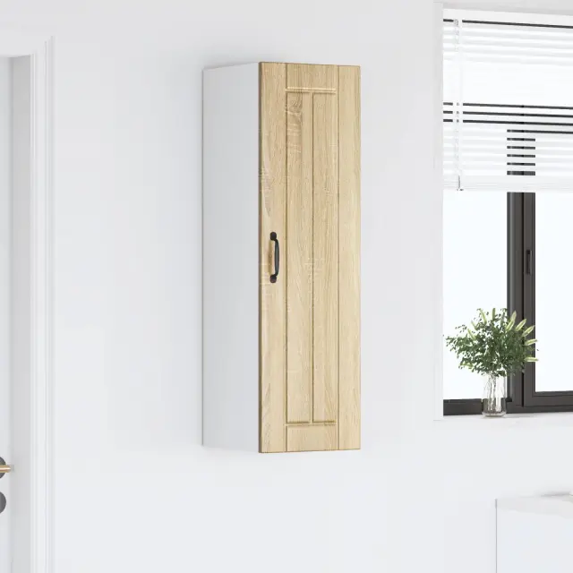 Ta lesena omara za kuhinjo s svojem elegantnim in modernim dizajnom dvigne vsako kuhinjo. Njena minimalistična oblika ponuja praktične rešitve za shranjevanje, tako da so vse stvari organizirane in urejene. Čiste linije in inženirski les dodajo sodoben pridih za vse, ki cenijo tako slog kot funkcionalnost.