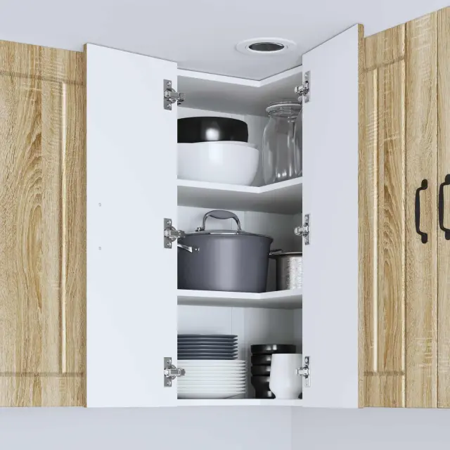 Ta lesena omara za kuhinjo s svojem elegantnim in modernim dizajnom dvigne vsako kuhinjo. Njena minimalistična oblika ponuja praktične rešitve za shranjevanje, tako da so vse stvari organizirane in urejene. Čiste linije in inženirski les dodajo sodoben pridih za vse, ki cenijo tako slog kot funkcionalnost.