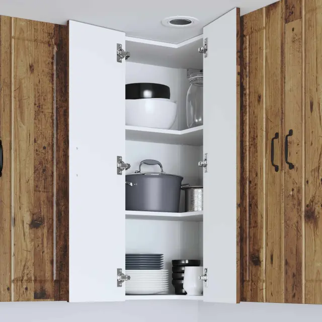 Ta lesena omara za kuhinjo s svojem elegantnim in modernim dizajnom dvigne vsako kuhinjo. Njena minimalistična oblika ponuja praktične rešitve za shranjevanje, tako da so vse stvari organizirane in urejene. Čiste linije in inženirski les dodajo sodoben pridih za vse, ki cenijo tako slog kot funkcionalnost.