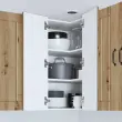 Ta lesena omara za kuhinjo s svojem elegantnim in modernim dizajnom dvigne vsako kuhinjo. Njena minimalistična oblika ponuja praktične rešitve za shranjevanje, tako da so vse stvari organizirane in urejene. Čiste linije in inženirski les dodajo sodoben pridih za vse, ki cenijo tako slog kot funkcionalnost.