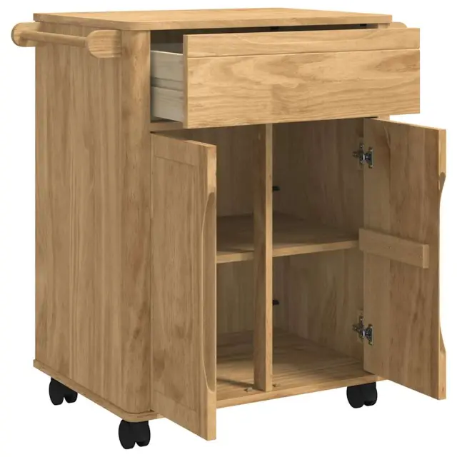 Ta kuhinjski voziček prinaša eleganco in uporabnost vsaki kuhinji. Njegove preproste linije in minimalistični dizajn se odlično prilegajo sodobnim domovom, kar dviguje splošno estetiko in zagotavlja funkcionalnost. Narejen iz trdnega borovega lesa, ta voziček je lepo oblikovan, kar dopolnjuje tvoj notranji stil. Idealno za ljubitelje kuhanja, ta kos spodbuja učinkovitost in stil v tvojem kuhinjskem prostoru.