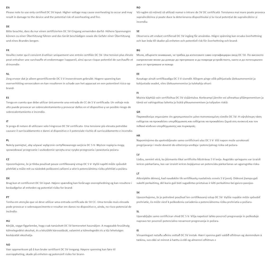 Uporabljajte samo certificiran vhod DC 5 V. Višja napetost lahko povzroči pregrevanje in poškoduje napravo ter povzroči potencialno nevarnost pregrevanja in požara.