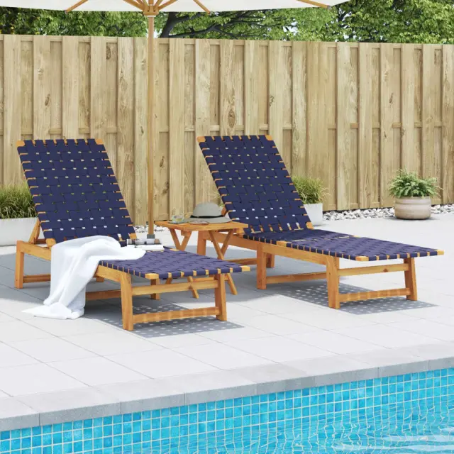 Ti klasični ležalniki iz poli ratana bodo idealni za sončenje in sproščanje v bližini bazena, na terasi ali na vrtu. Trden akacijev les: Trden akacijev les je čudovit naravni material. Akacijev les je tropski trden les, ki je gost, močan in vzdržljiv. Zato je okvir ležalnika iz akacijevega lesa z oljnim premazom stabilen in enostaven za vzdrževanje.Material z dolgo življenjsko dobo: Olefinska vlakna, znana tudi kot polipropilenska vlakna (PP), so udobna, trpežna, dolgotrajna in zelo odporna na bledenje zaradi sončne svetlobe.Nastavljivo naslonjalo za hrbet: Udoben ležalnik ima nastavljivo naslonjalo za hrbet s 4 položaji za optimalno sprostitev.Trpežna mizna plošča: Letvena mizna plošča zunanje mize je zasnovana tako, da omogoča enostavno odvajanje vode, poleg tega pa nudi odlično podlago za pijačo, prigrizke, košare s sadjem in vaše najljubše okraske.Prepletena zasnova: Sedež in hrbtni del vrtnega ležalnika sta zasnovana s prepleteno tkanino za udobje, eleganco in zračnost. Dobro je vedeti:Če želite, da vaše zunanje pohištvo ostane lepo, vam priporočamo, da ga zaščitite z vodoodporno prevleko.Potrebno sestavljanje: DaVrtni ležalnik:Barva: Temno modra in rjavaMaterial: Tkanina (100 % olefin), trden akacijev les z oljnim premazomDimenzije: 157 x 55 x 60/74/87 cm (D x Š x V)Dimenzije (popolnoma raztegnjen): 201 x 55 x 30 cm (D x Š x V)Višina sedeža, merjena od tal: 30 cmNaslonjalo za hrbet s 4 nastavljivimi položajiMaksimalna nosilnost (na sedež): 110 kgMiza:Material: Trden akacijev les z oljnim premazomDimenzije: 40 x 40 x 40 cm (D x Š x V)Paket vsebuje:2 x Ležalnik1 x Miza 3214218