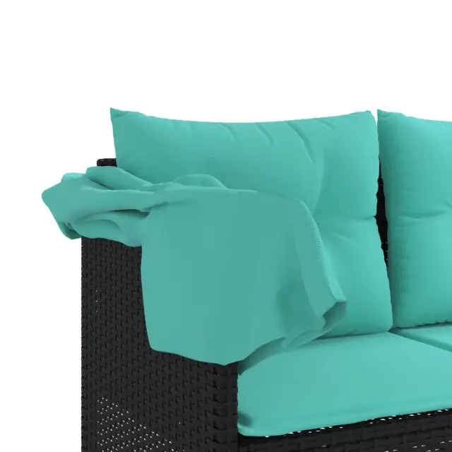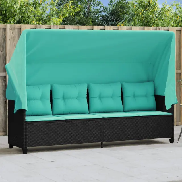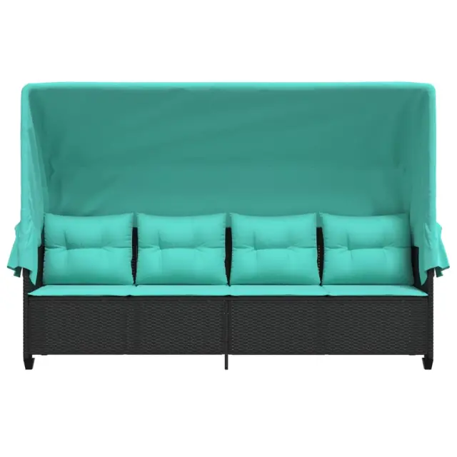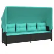 vidaXL Ležalnik s streho in blazinami črn poli ratan