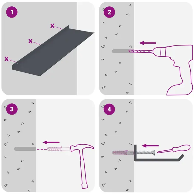 • Enostavna namestitev Polica je zasnovana za hitro in enostavno montažo na steno z osnovnimi orodji. Vijaki niso vključeni, takže jih izberite glede na svojo steno.