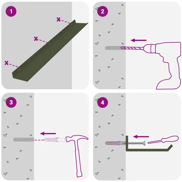 • Enostavna namestitev Polica je zasnovana za hitro in enostavno montažo na steno z osnovnimi orodji. Vijaki niso vključeni, takže jih izberite glede na svojo steno.