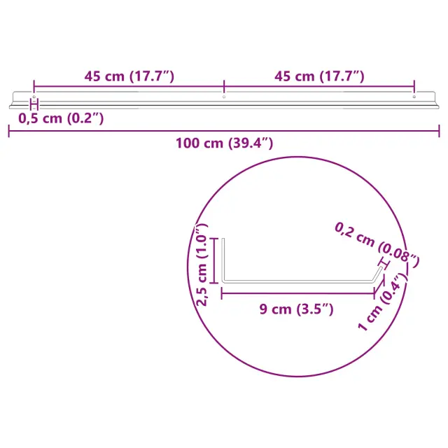 • Splošne dimenzije: 100 x 9 x 2,5 cm (D x Š x V)