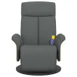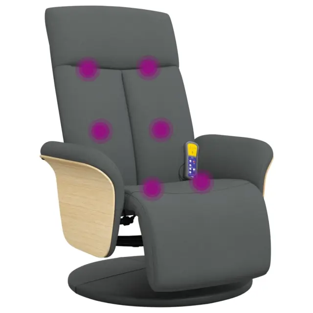 Namestite se in uživajte na tem izjemno udobnem masažnem naslanjaču! Funkcija vibriranja: 6 masažnih točk vam omogoča, da izkusite bolje usmerjeno masažo. Poleg tega vam priloženi ročni upravljalnik omogoča izbiro različnih programov masaže. Masažna funkcija se napaja prek priključka USB, ki zahteva certificiran 5V vir napajanja USB (ni priložen).Nastavljivo naslonjalo za hrbet in podnožje: Ta masažni stol je posebej zasnovan s funkcijo nagibanja, tako da lahko naslonjalo za hrbet in naslon za noge prilagodite svojemu udobju. Naslonjalo je mogoče nagniti od 105 do 125 stopinj.360-stopinjsko vrtenje: Masažni naslanjač se lahko prosto obrača za 360 stopinj, kar mu omogoča dodatno prilagodljivost.Udobno sedenje: Sedež, naslonjalo za hrbet in široki nasloni za roke, prevlečeni s tkanino, zagotavljajo prijeten in topel občutek, zato se med sedenjem počutite prijetno. Preprosta in čista tkanina je tudi zračna in trpežna.Trden in stabilen okvir: Okvir iz vezanega lesa in kovine zagotavlja trdno strukturo in stabilnost. Ta masažni naslanjač je udoben in trpežen.Barva: Temno sivaMaterial: Blago (100 % poliester), vezan les, kovinaMaterial polnila: PenaDimenzije v sedečem položaju: 79 x 87 x 104,5 cm (Š x G x V)Dimenzije v ležečem položaju: 79 x 128 x 95 cm (Š x G x V)Širina sedeža: 51 cmGlobina sedeža: 65 cmVišina naslonjal za roke, merjena od tal: 53 cmPremer okroglega podstavka: 70 cmTip masaže: 6 točkovna vibracijska masažaVhodna napetost: DC 5VVhodni tok: 2AMaksimalna nosilnost: 110 kgPotrebno sestavljanje: Da 356534