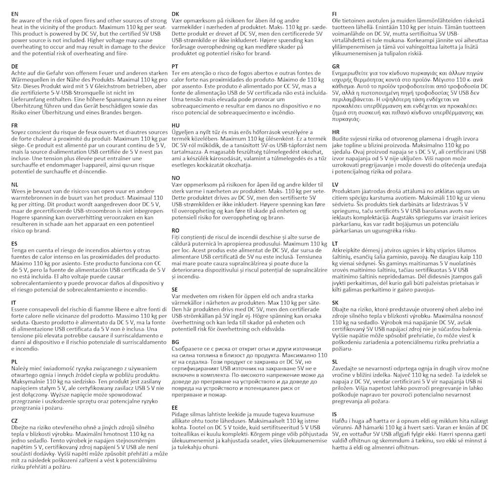 Zavedajte se nevarnosti odprtega ognja in drugih virov močne vročine v bližini izdelka. Največ 110 kg na sedež. Ta izdelek se napaja z DC 5V, vendar certificirani 5 V vir napajanja USB ni priložen. Višja napetost lahko povzroči pregrevanje in lahko poškoduje napravo ter povzroči potencialno nevarnost pregrevanja ali požara.