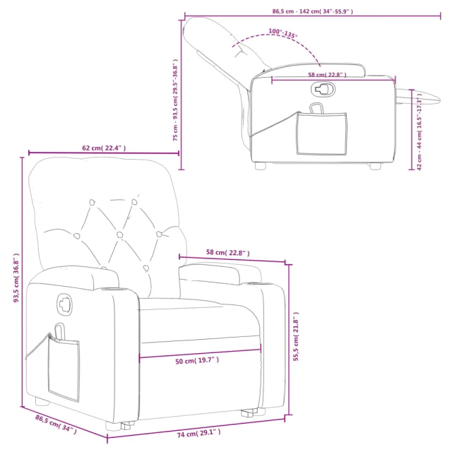 • Funkcija ročnega nagiba: Ta stol z nagibom ima ročaj na desni strani. S preprostim potegom ročaja lahko ročno nastavite naslon za noge in naslonjalo za hrbet v poljuben položaj glede na vaše udobje. Ta funkcija omogoča največji nagib 135 stopinj. Poleg tega lahko naslonjalo hitro vrnete na prvotno mesto z enostavnim potegom ročaja.