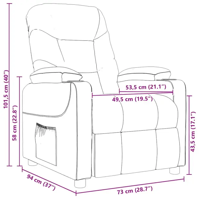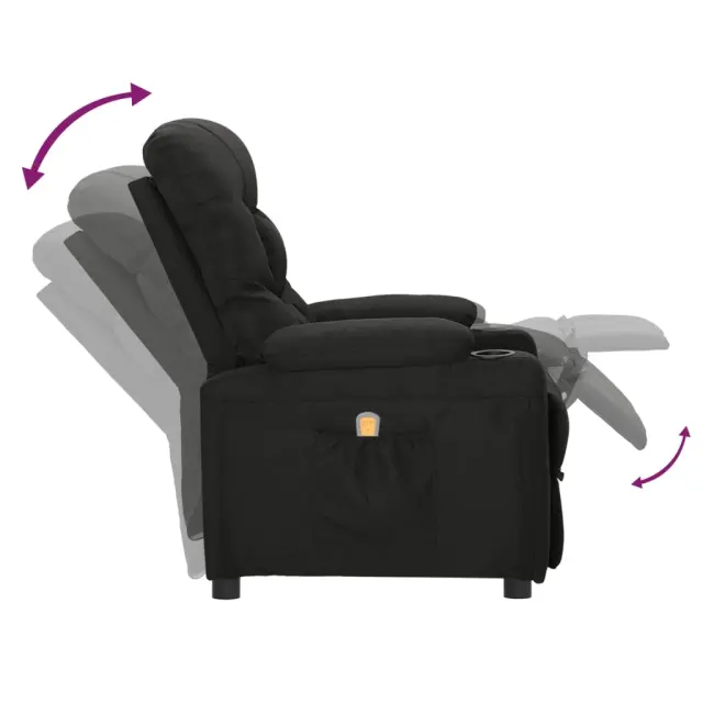Namestite se in uživajte na tem izjemno udobnem masažnem stolu! Funkcija ročnega nagiba: Ležalnik je posebej zasnovan s 3 položaji nagiba, tako da lahko ročno nastavite naslonjalo in oporo za noge glede na vaše udobje.Funkcija vibriranja: 6 masažnih točk vam omogoča, da izkusite bolje usmerjeno masažo. Poleg tega vam priloženi ročni upravljalnik omogoča izbiro različnih programov masaže. Masažno funkcijo napaja USB priključek, vendar certificiran 5V vir napajanja USB ni priložen.Udobno sedenje: Sedež, naslonjalo za hrbet in široki nasloni za roke, prevlečeni s tkanino, zagotavljajo prijeten in topel občutek, zato se med sedenjem počutite prijetno. Preprosta in čista tkanina je tudi zračna in trpežna.Trden in stabilen okvir: Okvir iz lesa in kovine zagotavlja trdno strukturo in stabilnost. Ta naslanjač je udoben in trpežen.Barva: ČrnaMaterial: Blago (100 % poliester), kovinaCelotne dimenzije: 75 x 93 x 104,5 cm (Š x G x V)Dimenzije v ležečem položaju: 75 x 144 x 84,5 cm (Š x G x V)Velikost sedeža: 50 x 53,5 cm (Š x G)Višina sedeža, merjena od tal: 43,5-60,5 cmVišina naslonjala za roke, merjena od tal: 58 cmMožnosti: MasažaTip masaže: 6 točkovna vibracijska masažaPrilagodljivo naslonjalo za hrbet in nogePotrebno sestavljanje: Da 339094