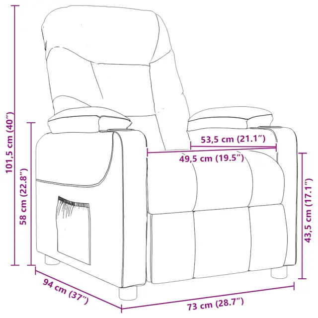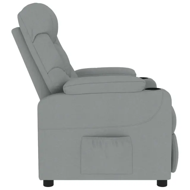 Namestite se in uživajte na tem izjemno udobnem masažnem stolu! Funkcija ročnega nagiba: Ležalnik je posebej zasnovan s 3 položaji nagiba, tako da lahko ročno nastavite naslonjalo in oporo za noge glede na vaše udobje.Funkcija vibriranja: 6 masažnih točk vam omogoča, da izkusite bolje usmerjeno masažo. Poleg tega vam priloženi ročni upravljalnik omogoča izbiro različnih programov masaže. Masažno funkcijo napaja USB priključek, vendar certificiran 5V vir napajanja USB ni priložen.Udobno sedenje: Sedež, naslonjalo za hrbet in široki nasloni za roke, prevlečeni s tkanino, zagotavljajo prijeten in topel občutek, zato se med sedenjem počutite prijetno. Preprosta in čista tkanina je tudi zračna in trpežna.Trden in stabilen okvir: Okvir iz lesa in kovine zagotavlja trdno strukturo in stabilnost. Ta naslanjač je udoben in trpežen.Barva: Svetlo sivaMaterial: Blago (100 % poliester), kovinaCelotne dimenzije: 75 x 93 x 104,5 cm (Š x G x V)Dimenzije v ležečem položaju: 75 x 144 x 84,5 cm (Š x G x V)Velikost sedeža: 50 x 53,5 cm (Š x G)Višina sedeža, merjena od tal: 43,5-60,5 cmVišina naslonjala za roke, merjena od tal: 58 cmMožnosti: MasažaTip masaže: 6 točkovna vibracijska masažaPrilagodljivo naslonjalo za hrbet in nogePotrebno sestavljanje: Da 339092