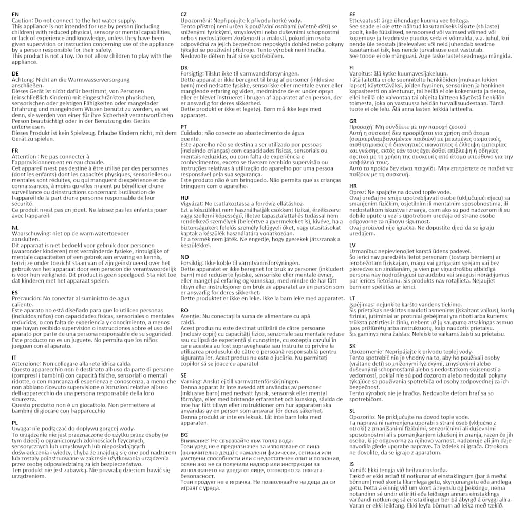 Opozorilo: Ne priključujte na dovod tople vode. Ta naprava ni namenjena uporabi s strani oseb (vključno z otroki) z zmanjšanimi fizičnimi, senzoričnimi ali duševnimi sposobnostmi ali s pomanjkanjem izkušenj in znanja, razen če jih oseba, ki je odgovorna za njihovo varnost, nadzoruje ali jim daje navodila glede uporabe naprave. Ta izdelek ni igrača. Otrokom ne dovolite, da se igrajo z aparatom.