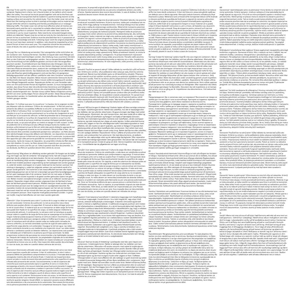 Ta trpežna mreža za zapiranje, izdelana iz 100 % HDPE (polietilena visoke gostote), je odporna na UV-žarke in vremenske vplive. Poleg tega je mogoče mrežo zaradi medeninastih očes varno pritrditi na kontejner in držati tovor na mestu.