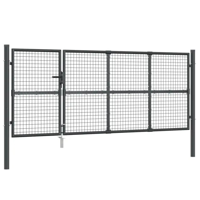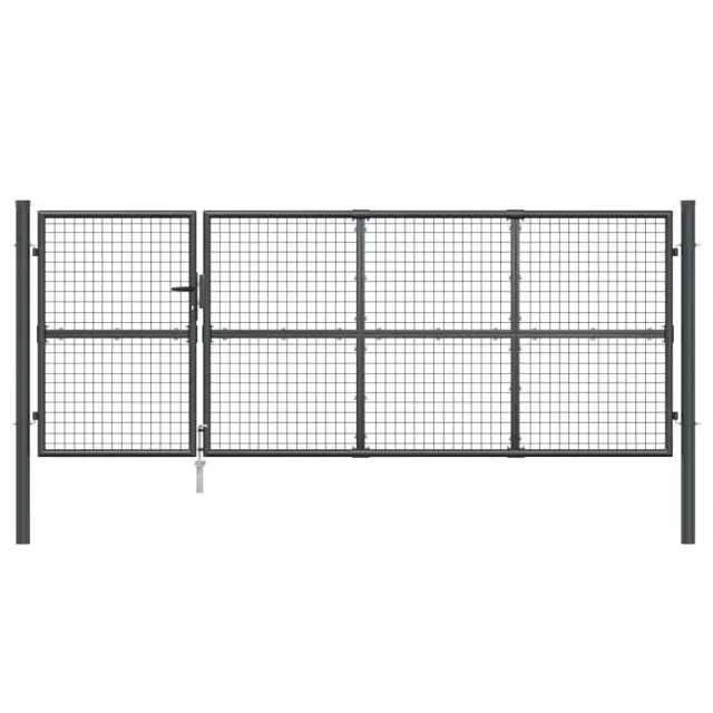 Vrtna vrata predstavljajo odlično kombinacijo moči, stabilnosti in odpornosti na korozijo! Zagotovo bodo idealna vstopna točka za vaš vrt, dvorišče ali teraso! Trpežen material: Jeklo je izjemno trd in močan material. Ponuja trdnost in stabilnost. Pocinkanje zagotavlja boljšo zaščito pred korozijo in je uporabno za izdelke, ki se bodo uporabljali na prostem kot tudi v zahtevnih okoljih.Zasnova z možnostjo zaklepanja: Zunanja vrata imajo talni količek za velik spodnji zapah, ki zagotavlja dobro zaklepanje vrat.Enostavno sestavljanje: Jeklena vrtna vrata imajo dva stranska stebrička z vijačnimi tečaji za enostavno namestitev.Barva: AntracitnaMaterial: Pocinkano jeklo s prašnim premazomCelotna velikost: 350 x 175 cm (Š x V)Višina panela: 125 cmPremer drogu: 7,5 cmVelikost mreže: 5 x 5 cm (D x Š)Vsebuje talni količekDobava vključuje tudi komplet ključavnice in 3 ključePotrebno sestavljanje: Da 154543