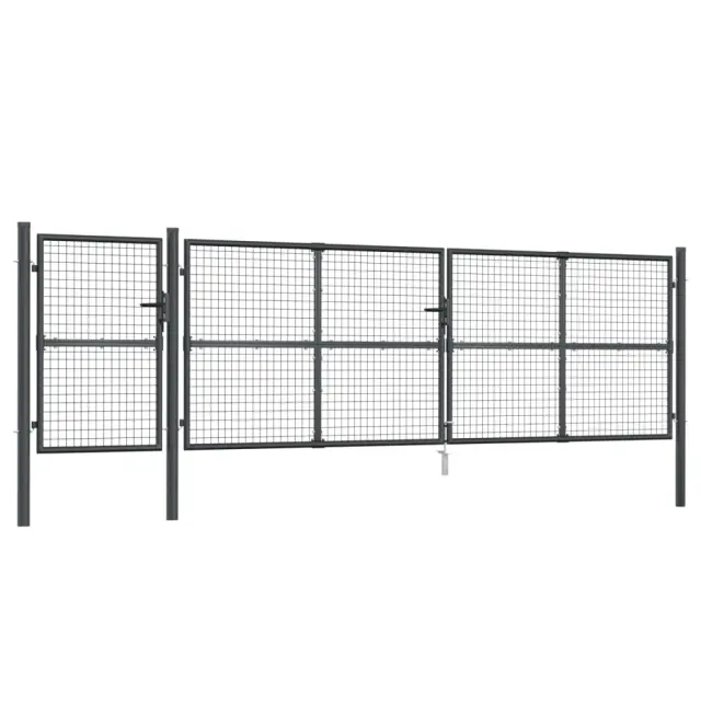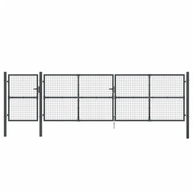 Vrtna vrata predstavljajo odlično kombinacijo moči, stabilnosti in odpornosti na korozijo! Zagotovo bodo idealna vstopna točka za vaš vrt, dvorišče ali teraso! Trpežen material: Jeklo je izjemno trd in močan material. Ponuja trdnost in stabilnost. Pocinkanje zagotavlja boljšo zaščito pred korozijo in je uporabno za izdelke, ki se bodo uporabljali na prostem kot tudi v zahtevnih okoljih.Zasnova z možnostjo zaklepanja: Zunanja vrata imajo talni količek za velik spodnji zapah, ki zagotavlja dobro zaklepanje vrat.Enostavno sestavljanje: Jeklena vrtna vrata imajo dva stranska stebrička z vijačnimi tečaji za enostavno namestitev.Barva: AntracitnaMaterial: Pocinkano jeklo s prašnim premazomCelotna velikost: 500 x 175 cm (Š x V)Višina panela: 125 cmPremer drogu: 7,5 cmVelikost mreže: 5 x 5 cm (D x Š)Vsebuje talni količekDobava vključuje tudi 2 kompleta ključavnic in 6 ključevPotrebno sestavljanje: Da 154549