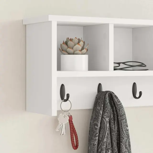 • Police, pritrjene na steno Rack ima police, pritrjene na steno, kar je idealno za varčevanje s talnim prostorom in ohranjanje urejenega videza. Te police nudijo prostor za torbe, kape ali dekorativne predmete, kar omogoča kar najbolje izkoristiti vaš hodnik ali vhodni prostor.