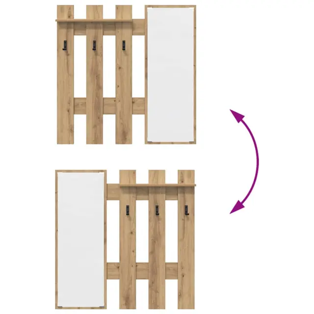 Ta stenski obešalnik za plašče združuje shranjevalno funkcijo z modernim look-om, kar ga naredi idealnega za vsak hodnik ali vhod. Njegova elegantna pravokotna oblika iz inženirskega lesa nudi preprosto rešitev za organizacijo plaščev, dodatkov in vsakih potrbščin.
