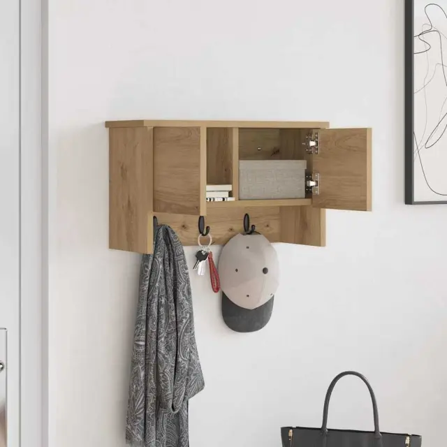 Ta stenski obešalnik za plašče se ponaša s sodobnim dizajnom, ki je elegantno enostaven, kar ga naredi idealnega za moderne prostore. Narejen iz inženirskega lesa, ponuja odlično rešitev za organizacijo hodnikov in združuje funkcionalnost s čistim, minimalističnim videzom.