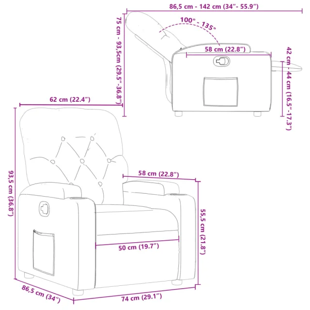 • Funkcija ročnega nagiba: Ta stol z nagibom ima ročaj na desni strani. S preprostim potegom ročaja lahko ročno nastavite naslon za noge in naslonjalo za hrbet v poljuben položaj glede na vaše udobje. Ta funkcija omogoča največji nagib 135 stopinj. Poleg tega lahko naslonjalo hitro vrnete na prvotno mesto z enostavnim potegom ročaja.
