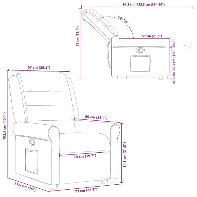 • Funkcija ročnega nagiba: Ta stol z nagibom ima ročaj na desni strani. S preprostim potegom ročaja lahko ročno nastavite naslon za noge in naslonjalo za hrbet v poljuben položaj glede na vaše udobje. Ta funkcija omogoča največji nagib 135 stopinj. Poleg tega lahko naslonjalo hitro vrnete na prvotno mesto z enostavnim potegom ročaja.