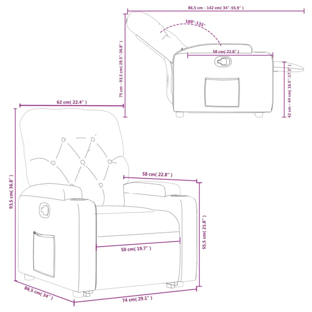 • Funkcija ročnega nagiba: Ta stol z nagibom ima ročaj na desni strani. S preprostim potegom ročaja lahko ročno nastavite naslon za noge in naslonjalo za hrbet v poljuben položaj glede na vaše udobje. Ta funkcija omogoča največji nagib 135 stopinj. Poleg tega lahko naslonjalo hitro vrnete na prvotno mesto z enostavnim potegom ročaja.