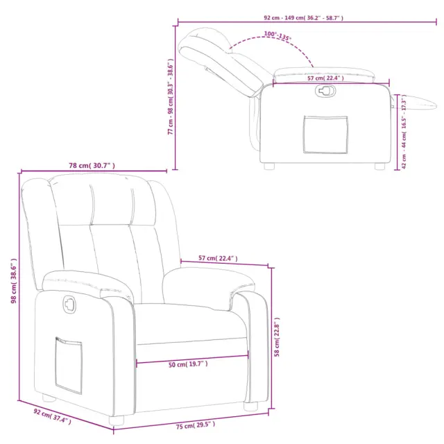 • Ročna funkcija nagibanja: Ta naslanjač ima ročaj na desni strani. Naslonjalo za noge in naslonjalo lahko ročno nastavite v kateri koli položaj, ki vam ustreza, z enostavnim potegom ročaja. Ta funkcija omogoča največji nagib 135 stopinj. Poleg tega se naslonjalo lahko z enostavnim potegom ročaja hitro vrne v prvotni položaj.