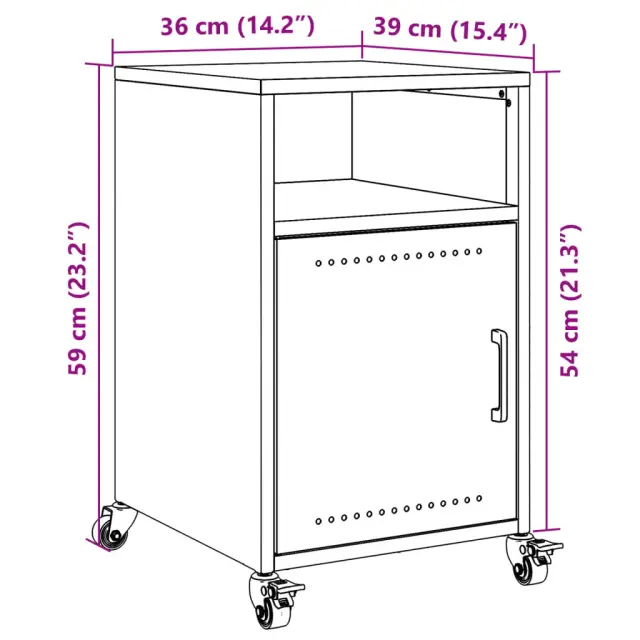 Ta nočna omarica s stilskim dizajnom predstavlja brezčasen dodatek za dekor v vaših notranjih prostorih. Stabilen material: Nočna omarica je izdelana iz hladno valjanega jekla. Hladno valjano jeklo je vrsta nizkoogljičega jekla, ki se proizvaja z metodo "hladnega valjanja" in obdeluje pri skoraj običajnih sobnih temperaturah. Hladno valjano jeklo ima bolj gladko površino, večjo trdnost in natančnost.Veliko prostora za shranjevanje: Ta omarica ponuja priročen prostor za shranjevanje vaših revij, knjig, daljinskih upravljalnikov in drugih majhnih predmetov, da bodo dobro urejeni in na dosegu roke.Enostavno vzdrževanje: Mizico je enostavno očistiti z vlažno krpo, poleg tega ne potrebuje veliko vzdrževanja.Enostavno premikanje: Ta odstavna mizica ima 4 kolesa, ki omogočajo enostavno premikanje in stabilno parkiranje.Praktičen ročaj: Omarici je priložen ročaj, ki olajša odpiranje in zapiranje omare, obenem pa poskrbi za dodatno lepoto.Barva: Gorčično rumenaMaterial: Hladno valjano jekloDimenzije: 36 x 39 x 59 cm (D x Š x V)Z 1 vratiZ 2 prostoroma za shranjevanjePotrebno sestavljanje: Da 846722