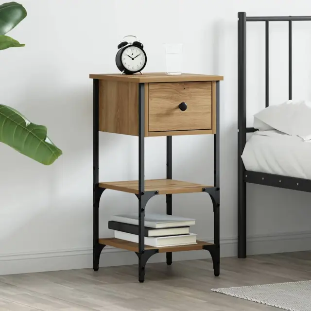 • Materiali in izdelava: Nočna omarica je narejena iz obdelanega lesa in železa, kar ponuja robustno, odporna na praske.
