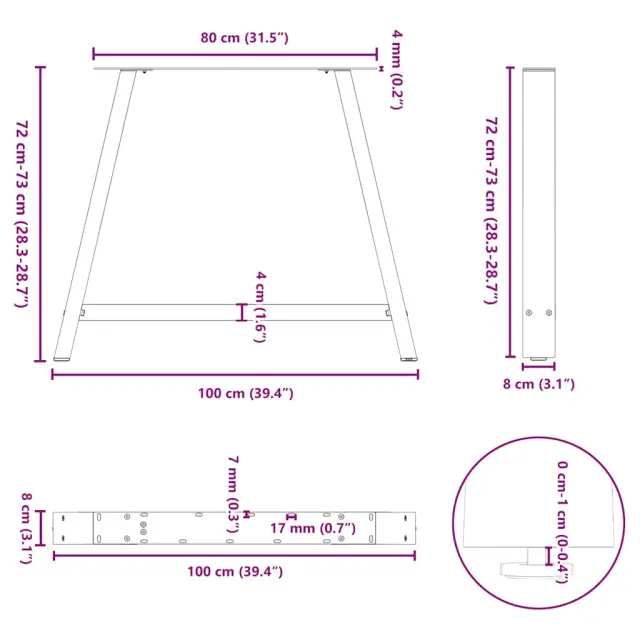• Praktična oblika: Noga jedilne mize ima nastavljive nivelatorje, ki zagotavljajo stabilnost tudi na neravnih tleh in zmanjšujejo praske na tleh. Poleg tega ima nosilec predhodno izvrtane luknje in priložene vijake, s katerimi lahko nogo pritrdite na mizno površino (niso priloženi), kar olajša montažo.