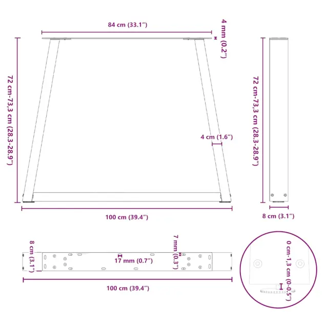 • Praktična oblika: Noga jedilne mize ima nastavljive nivelatorje, ki zagotavljajo stabilnost tudi na neravnih tleh in zmanjšujejo praske na tleh. Poleg tega ima nosilec predhodno izvrtane luknje in priložene vijake, s katerimi lahko nogo pritrdite na mizno ploščo (niso priloženi), kar olajša montažo.