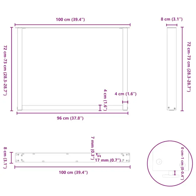 • Praktična oblika: Noga jedilne mize ima nastavljive nivelatorje, ki zagotavljajo stabilnost tudi na neravnih tleh in zmanjšujejo praske na tleh. Poleg tega ima nosilec predhodno izvrtane luknje in priložene vijake, s katerimi lahko nogo pritrdite na mizno površino (niso priloženi), kar olajša montažo.