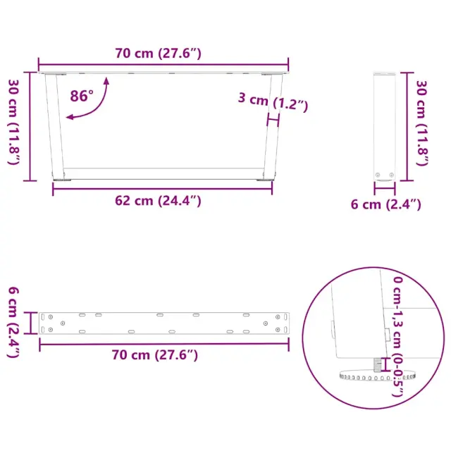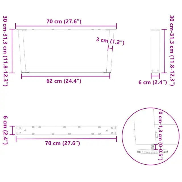 • Praktična oblika: Noga za klubsko mizico ima nastavljive nivelatorje, ki zagotavljajo stabilnost tudi na neravnih tleh in zmanjšujejo praske na tleh. Poleg tega ima nosilec predhodno izvrtane luknje in priložene vijake, s katerimi lahko nogo pritrdite na mizno ploščo (niso priloženi), kar olajša montažo.