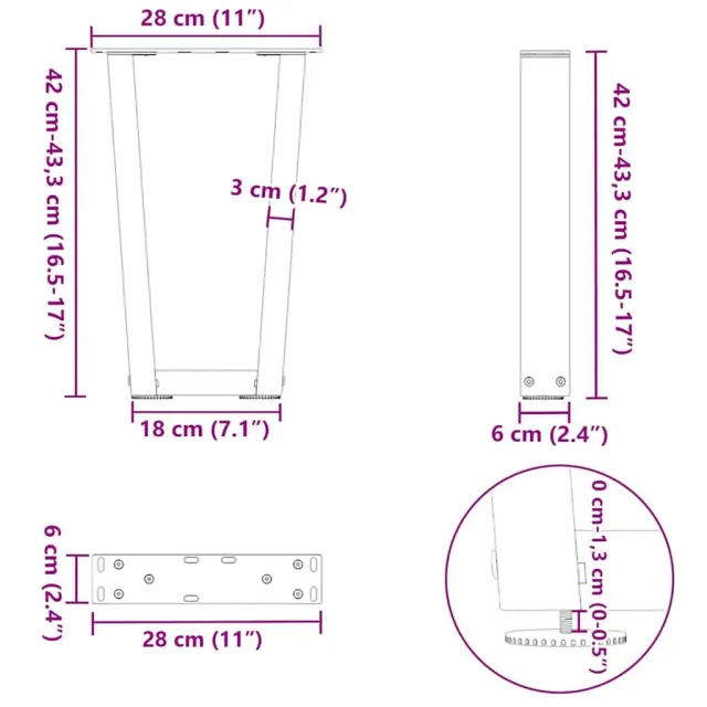 • Praktična oblika: Noga za klubsko mizico ima nastavljive nivelatorje, ki zagotavljajo stabilnost tudi na neravnih tleh in zmanjšujejo praske na tleh. Poleg tega ima nosilec predhodno izvrtane luknje in priložene vijake, s katerimi lahko nogo pritrdite na mizno ploščo (niso priloženi), kar olajša montažo.