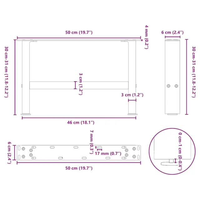 • Praktična oblika: Noga klubske mizice ima nastavljive nivelatorje, ki zagotavljajo stabilnost tudi na neravnih tleh in zmanjšujejo praske na tleh. Poleg tega ima nosilec predhodno izvrtane luknje in priložene vijake, s katerimi lahko nogo pritrdite na mizno površino (niso priloženi), kar olajša montažo.