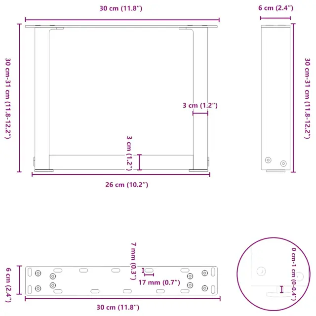 • Praktična oblika: Noga klubske mizice ima nastavljive nivelatorje, ki zagotavljajo stabilnost tudi na neravnih tleh in zmanjšujejo praske na tleh. Poleg tega ima nosilec predhodno izvrtane luknje in priložene vijake, s katerimi lahko nogo pritrdite na mizno površino (niso priloženi), kar olajša montažo.