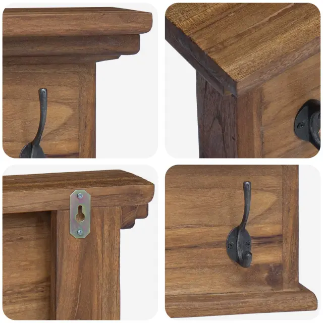 Ta obešalnik za plašče, pritrjen na steno, je eleganten in vsestranski dodatek vsaki hiši, ki združuje vintage šarm s sodobno praktičnostjo. Izdelan iz trdega tikovega lesa, ima gladko in fino obdelano površino v naravni barvi, ki podčrtuje njegov brezčasni videz. Odličen za organizacijo predsobe, dnevne sobe ali spalnice, ta obešalnik nudi dovolj prostora za plašče in klobuke ter se brez težav zlije z domačo dekoracijo.