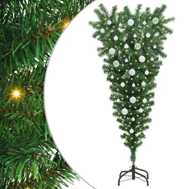 vidaXL Obrnjen umetni predhodno osvetljen božični drevesec s kompletnimi kroglicami