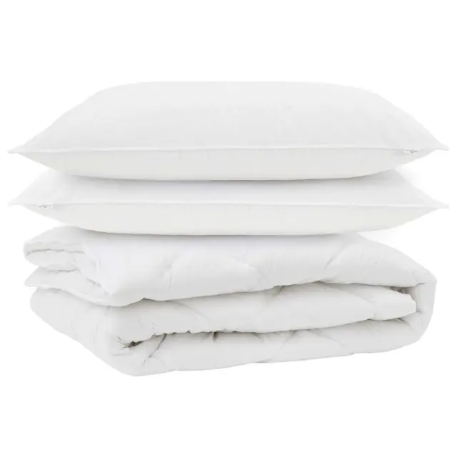 • Vključene komponente Paket vključuje eno posteljnino za vse sezone in dve blazini. Te komponente ustvarjajo usklajen sistem spanja, kar vam omogoča harmonično okolje za spanje. Blazine, izdelane iz poliestra, nudijo pravo mešanico mehkobe in podpore, da nežno podpirajo vašo glavo in izboljšajo kakovost vašega spanja.