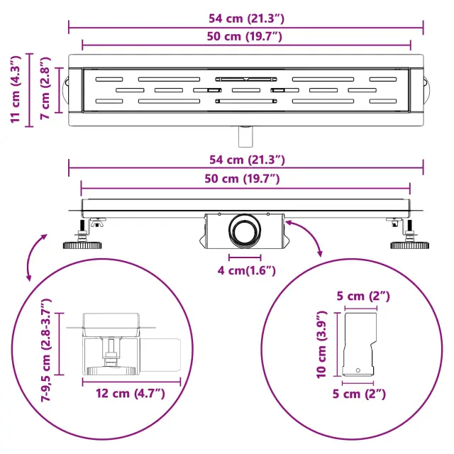 Ta moderen tuš odtok združuje slog in funkcionalnost. Z elegantno pravokotno obliko in konstrukcijo iz nerjavečega jekla je praktičen in privlačen dodatek, ki se brez težav prilega različnim modernim interierjem in ustvarja sproščujoče vzdušje v vaši kopalnici.