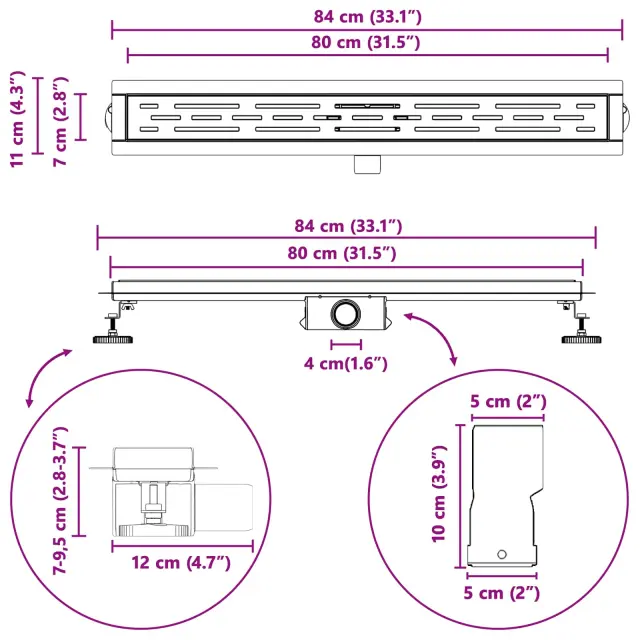 • Nerjaveča jeklena konstrukcija Ta odtok iz nerjavečega jekla 304 zagotavlja izjemno trajnost in odpornost. Poliran zaključek daje elegantno, moderno noto vaši kopalnici, medtem ko njegova moč zagotavlja dolgotrajno reševanje za učinkovito obvladovanje vode.