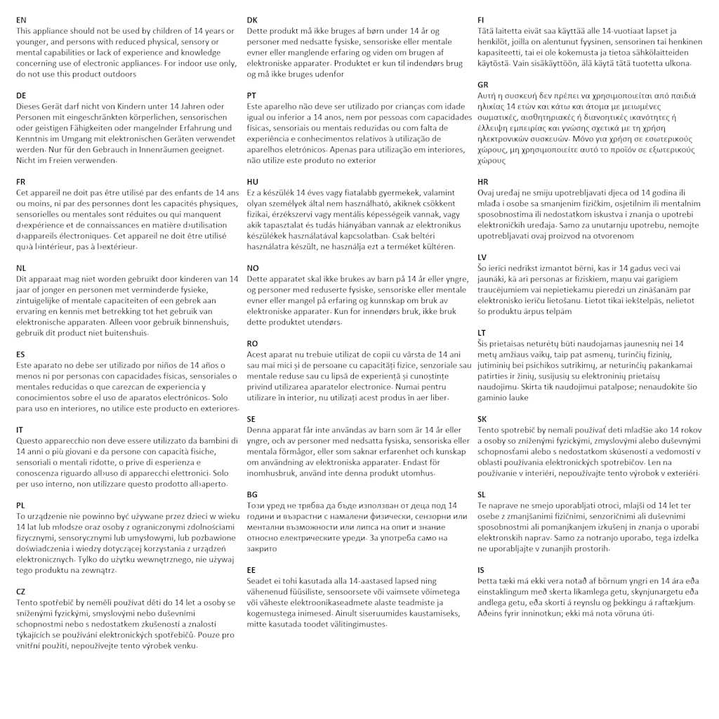 Te naprave ne smejo uporabljati otroci, mlajši od 14 let ter osebe z zmanjšanimi fizičnimi, senzoričnimi ali duševnimi sposobnostmi ali pomanjkanjem izkušenj in znanja o uporabi elektronskih naprav. Samo za notranjo uporabo, tega izdelka ne uporabljajte v zunanjih prostorih.