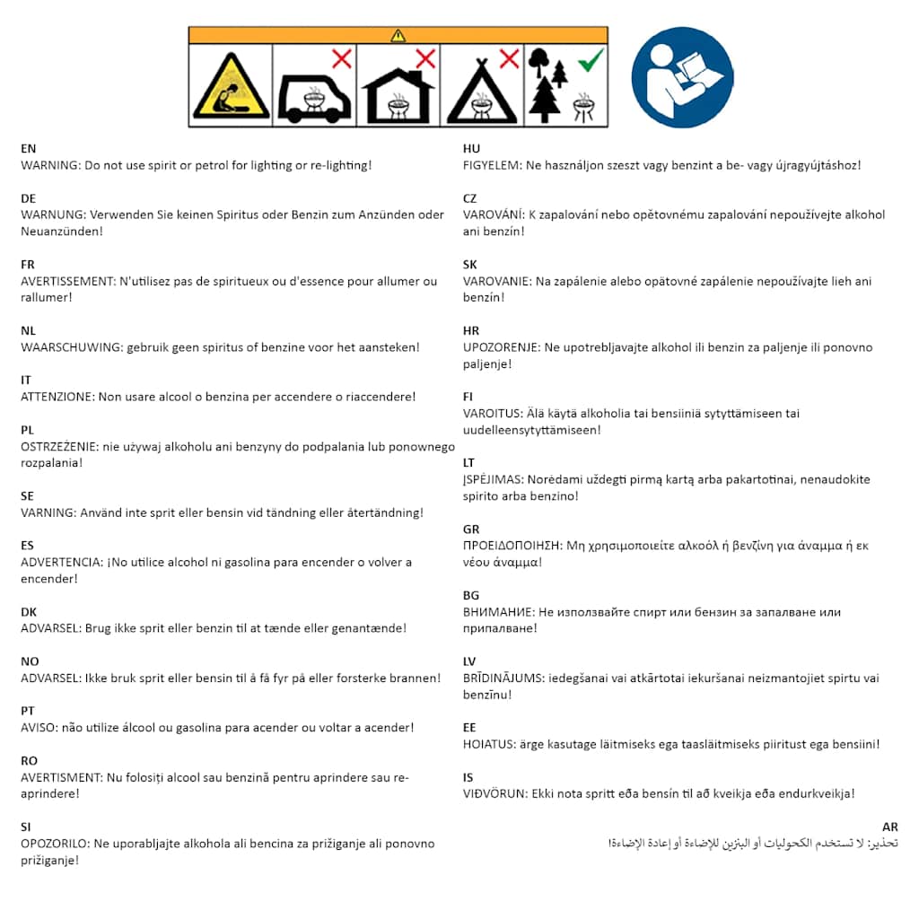 OPOZORILO: Ne uporabljajte alkohola ali bencina za prižiganje ali ponovno prižiganje!